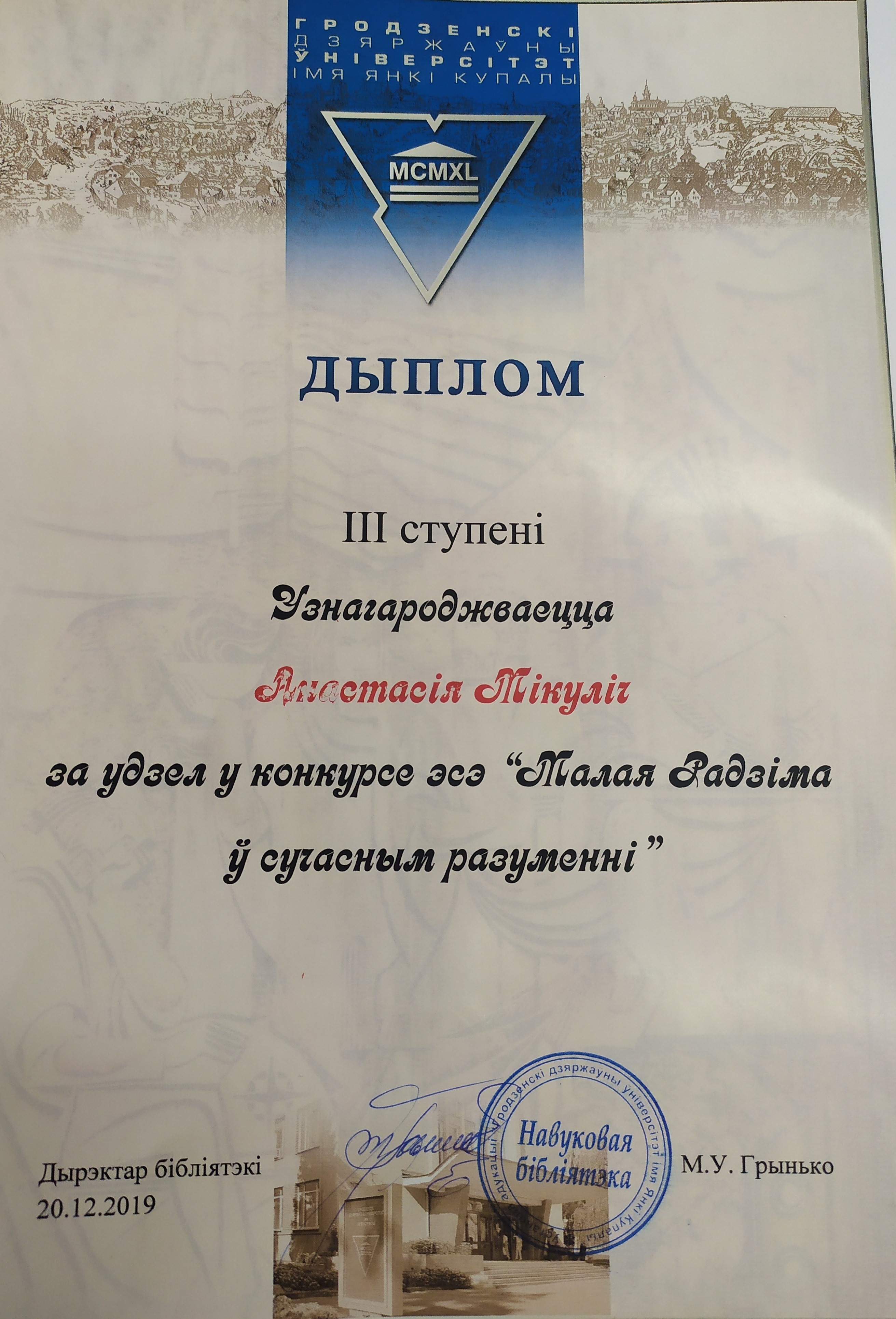 В рамках Плана мероприятий по проведению Года малой родины, плана работы научной библиотеки на 2019 год в учреждении образования «Гродненский государственный университет имени Янки Купалы» в период с 11.11.2019 по 20.12.2019 проводился конкурс эссе «Малая Радзіма ў сучасным разуменні».