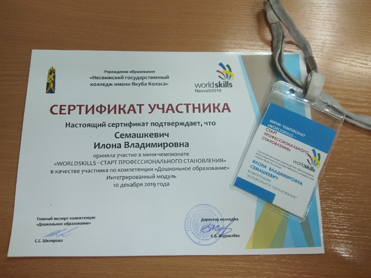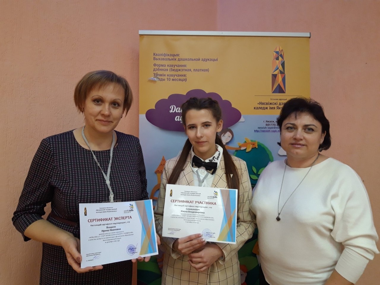 Семашкевич Илона получила сертификат участника конкурса, Вощило Ирина Ивановна, преподаватель спецдисциплин, – сертификат эксперта III МИНИ - ЧЕМПИОНАТА «WORLDSKILLS – СТАРТ ПРОФЕССИОНАЛЬНОГО СТАНОВЛЕНИЯ» по компетенции «Дошкольное образование».